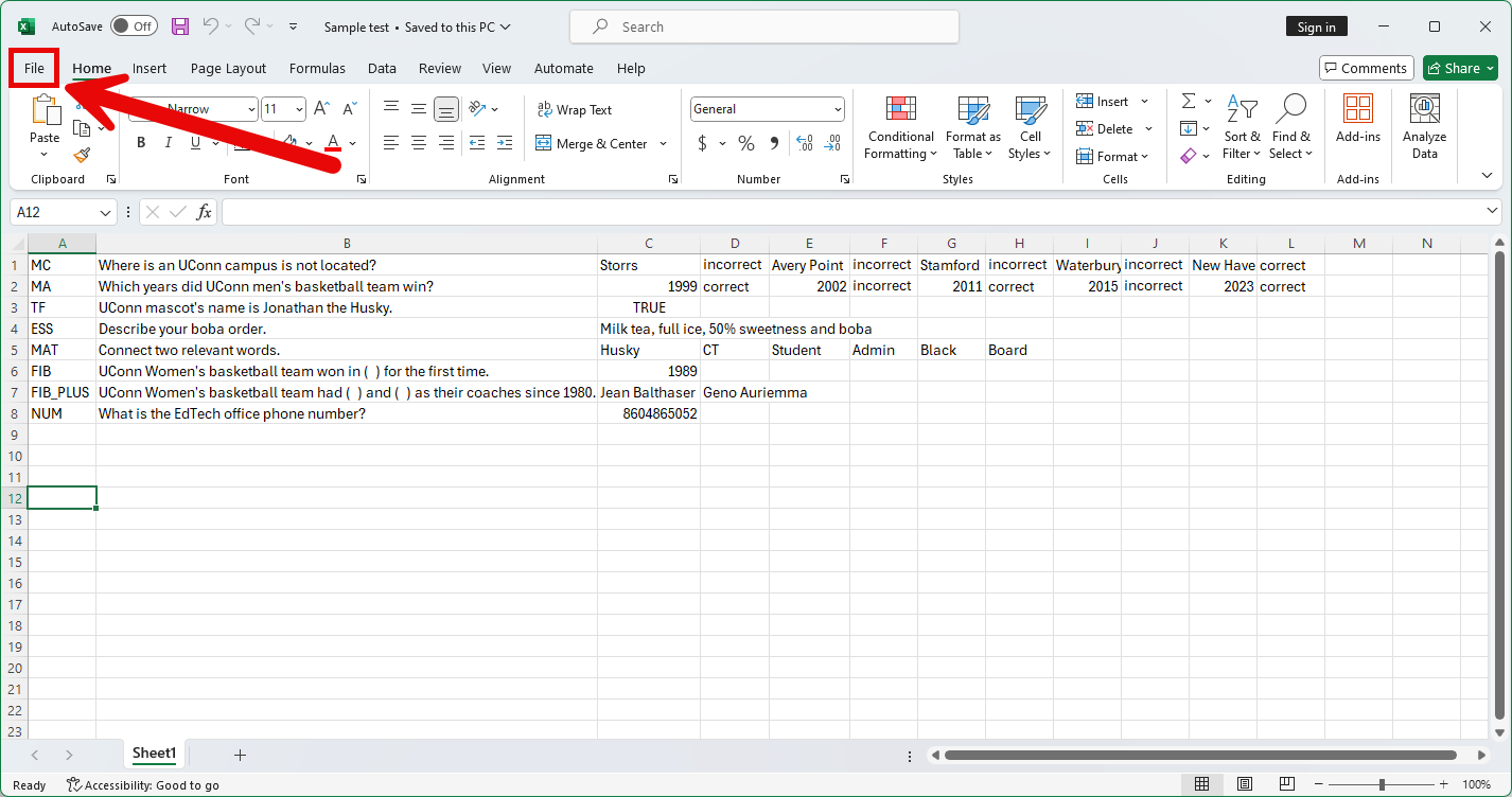 | Fill in the Blank | FIB TAB question text TAB answer text TAB answer two text Text within ( ) may be repeated for each of the answers that are part of the Fill in the Blank question. The maximum number of answers is 100. |
