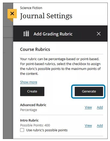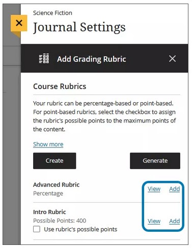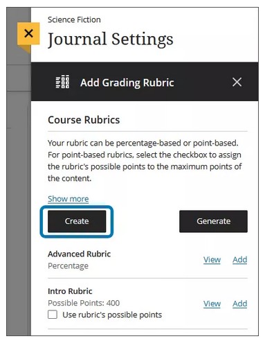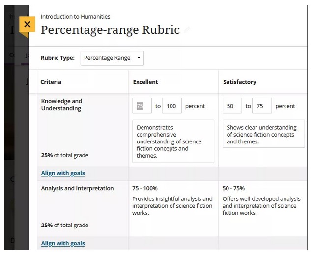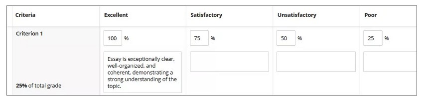 You can create multiple rubrics in your course. Rubrics consist of rows and columns. There are no limits to the number of rows and columns you can add to your rubrics. The rows correspond to the assessed criteria. The columns correspond to the level of achievement that describes each criterion. You can create four types of rubrics: percentage, percentage range, points, and points range. New rubrics have four rows and four columns. You can delete all but one row and one column. You can associate rubrics with assignments, discussions, and journals. [view screenshot]