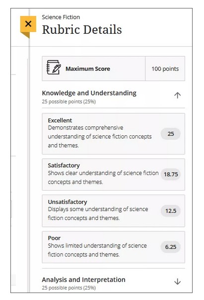 A rubric is a scoring tool you can use to evaluate graded work. When you create a rubric, you divide the assigned work into parts. You can provide clear descriptions of the characteristics of the work associated with each part, at varying levels of skill. Watch a video about rubrics.