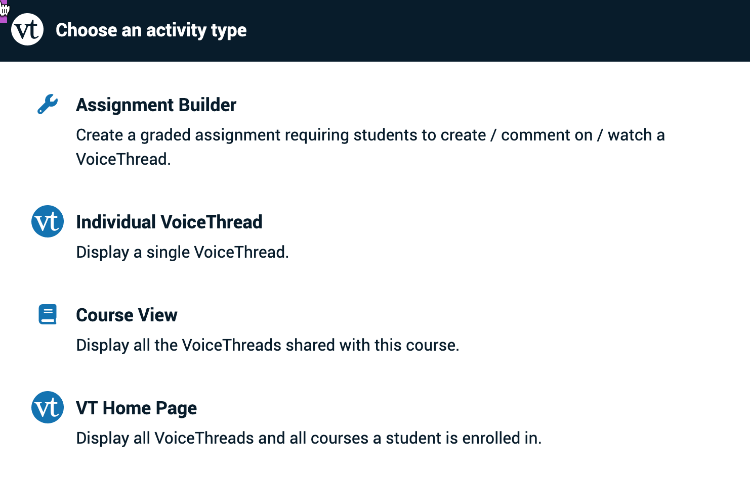 Online discussion boards are usually text-based and can sometimes limit the types of conversations in online learning environments, whereas VoiceThread allows instructors to create multimedia content and generate a conversation around it using text, audio, and video. The conversations are not live; they take place whenever and wherever it's convenient for students to participate.