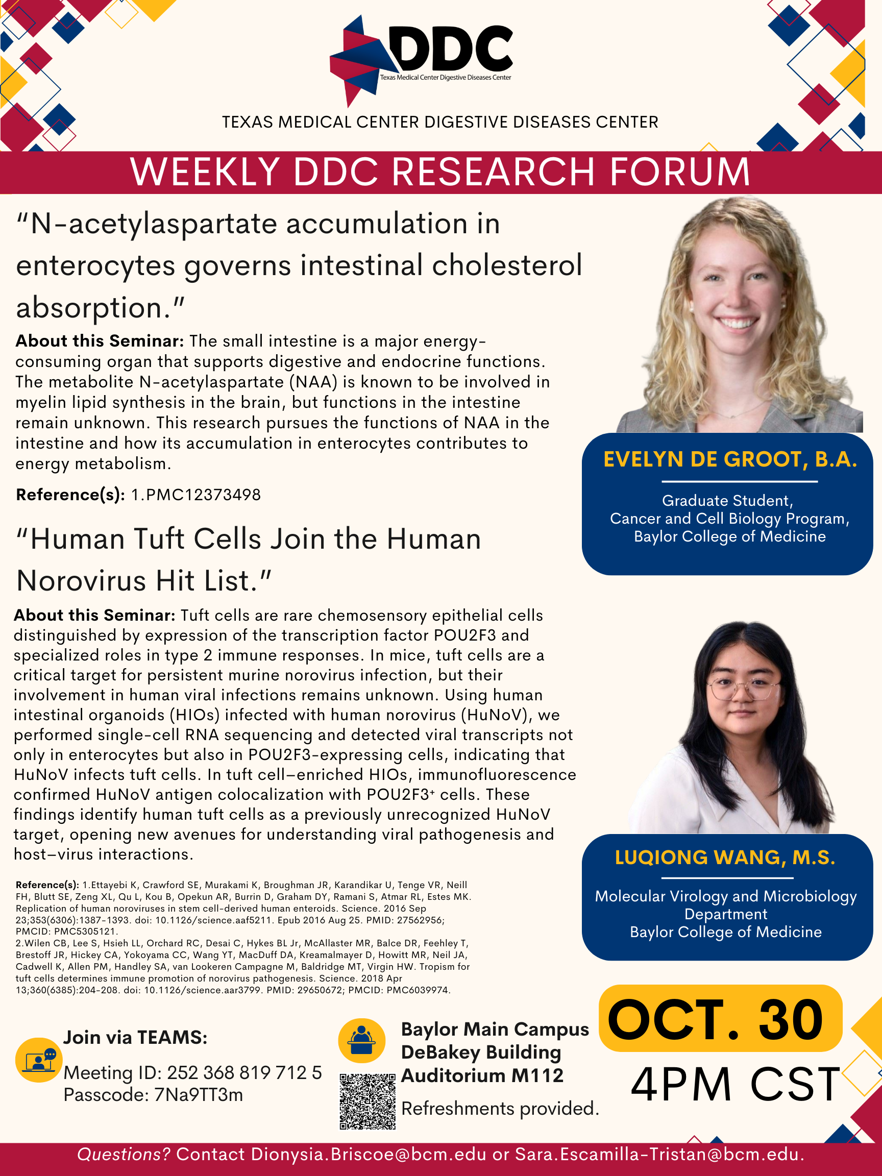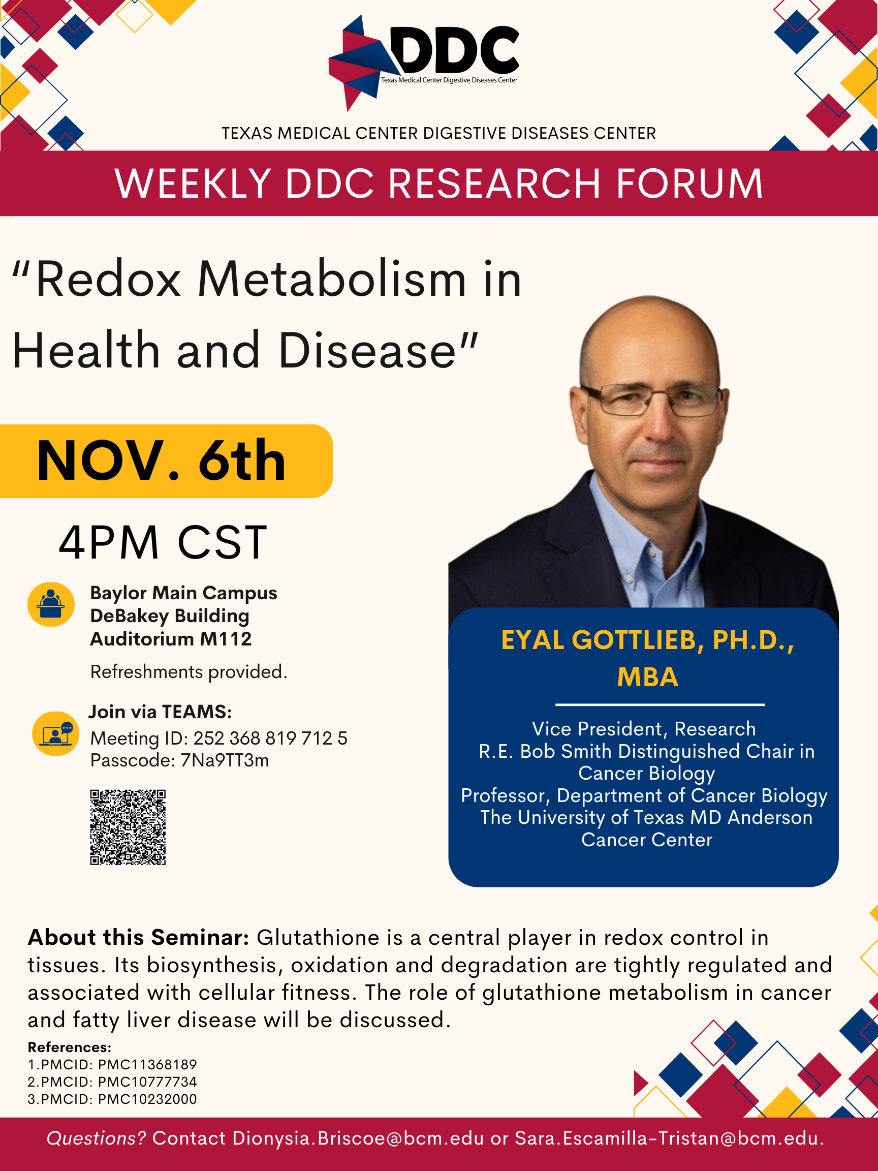 Join Us on Zoom Thursdays at 4 p.m. (passcode 2020). In-person seminars held at Baylor College of Medicine in auditorium M112 of the DeBakey building. Refreshments provided. In-person attendees can scan QR code to qualify for a $1,000 credit toward core services. Restrictions apply. Contact escamill@bcm.edu for more details.
